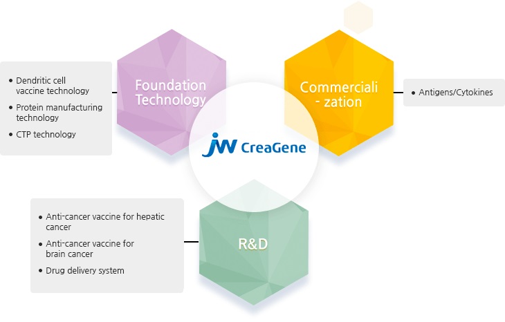 JW CreaGene holds the rights for the dendritic cell technology used in development of cancer treatment and drug delivery technology (CTP: Cytoplasmic Transduction Peptide) that can effectively deliver polymer substances to the cells as the key foundation technologies. Moreover, the company is developing dendritic cell therapeutics aimed at enhancing immunity and immune tolerance by applying the relevant technologies.