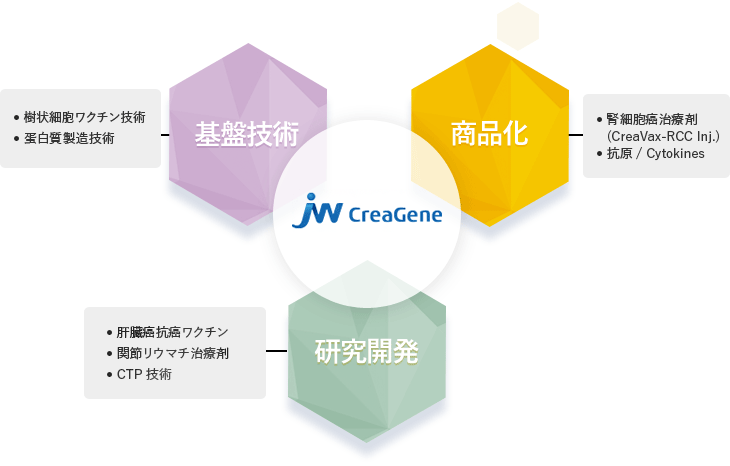 JWクレアジェンは癌治療剤の開発に利用されている樹状細胞 (Dendritic Cell)技術、高分子物質を細胞に効果的に伝えることができる薬物伝達技術(CTP:細胞質伝達ペプチド)を主な基盤技術として保有しており、関連技術を適用した免疫増強及び免疫寛容樹状細胞治療剤を開発しています。