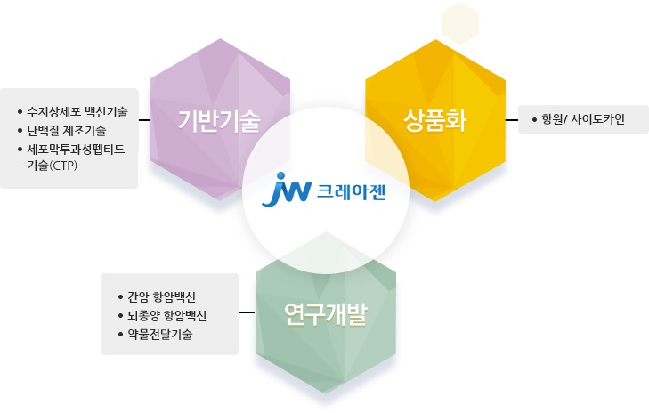 JW크레아젠은 인체 면역의 사령탑 역할을 하는 대표적인 항원제시세포인 수지상세포를 기반으로 부작용이 적으며 암 항원 인식과정을 통해 암세포만을 선택적으로 공격할 수 있는 수지상세포 항암 백신을 개발하고 있습니다. 이 항암 백신을 통해 1차 치료 후 발생하는 미세 잔존암을 제거함으로써 암의 재발과 전신 전이를 억제할 수 있을 것으로 기대합니다.