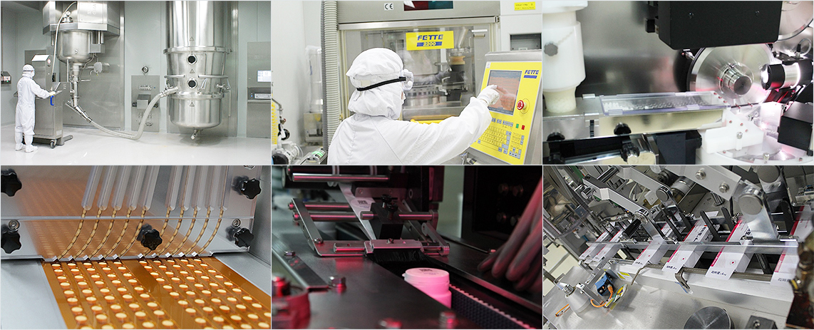 Solid Formulation Product line has built a Bin system to prevent external contamination and cross contamination. We are continuously managing the production of high quality products by introducing the latest facilities such as an automatic tablet sorting machine and fluidized bed assembly dryer. We also operate a variety of high-definition lines including finasteride formulations and double-sided pills.
