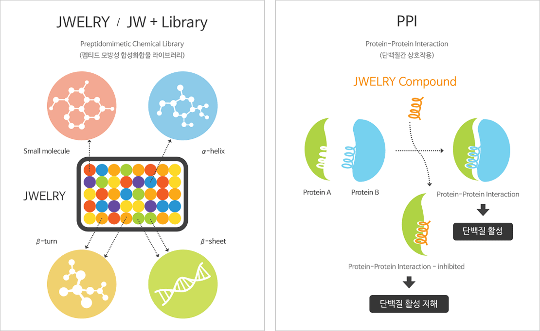 생체 내 다양한 시그널은 무수히 많은 단백질간의 상호작용 (Protein-Protein Interaction) 을 통해 전달되는데, 암, 면역질환 등 다양한 생명현상을 나타내는 단백질간 상호작용 (Protein-Protein Interaction)을 조절하기 위하여 단백질의 3차원적 구조를 모방한 펩티드 유사 구조 화합물 (a-helix, b-turn, b-sheet)로 구성된 화합물 라이브러리를 구축. JWERLY 화합물을 이용하여 고효율 스크리닝 시스템을 통해 단백질 상호 작용을 조절하는 혁신 신약 후보 물질들이 발굴되고 있습니다.