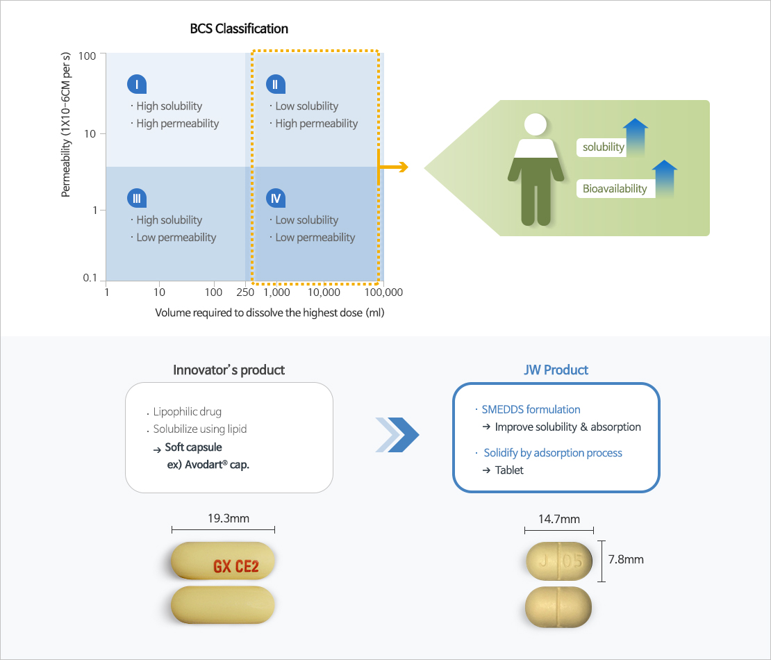 - JW중외제약의 독자적인 기술로서, 기존 난용성 약물 제형의 단점 및 한계를 극복하고 약물의 용해도 및 생체이용률을 향상시켜 약물의 안전성 개선과 복용편리성을 극대화한 제제 기술임