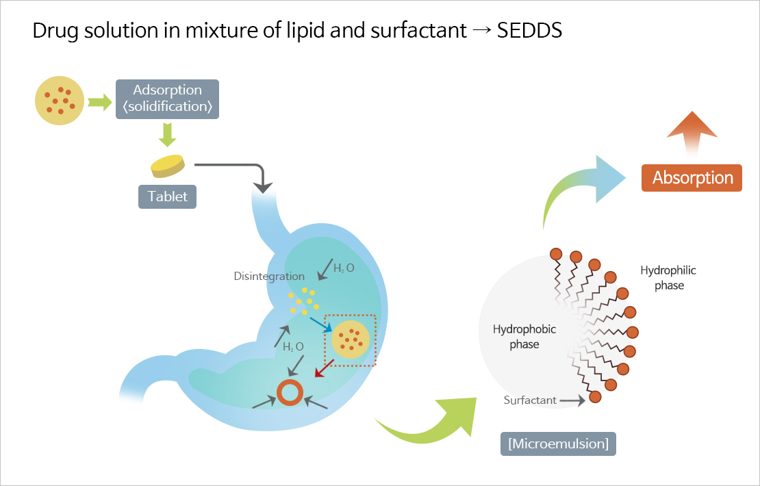 SMEDDS (Self micro emulsifying drug delivery system)란 난용성약물의 생체 이용율을 향상시키기 위한 가용화 기술로 난용성 약물에 계면활성제, 보조계면활성제, 오일을 배합하여 복용 후 체액과 함께 희석되어 입도가 작은 에멀젼을 형성하여 생체이용률을 향상시키는 기술입니다.