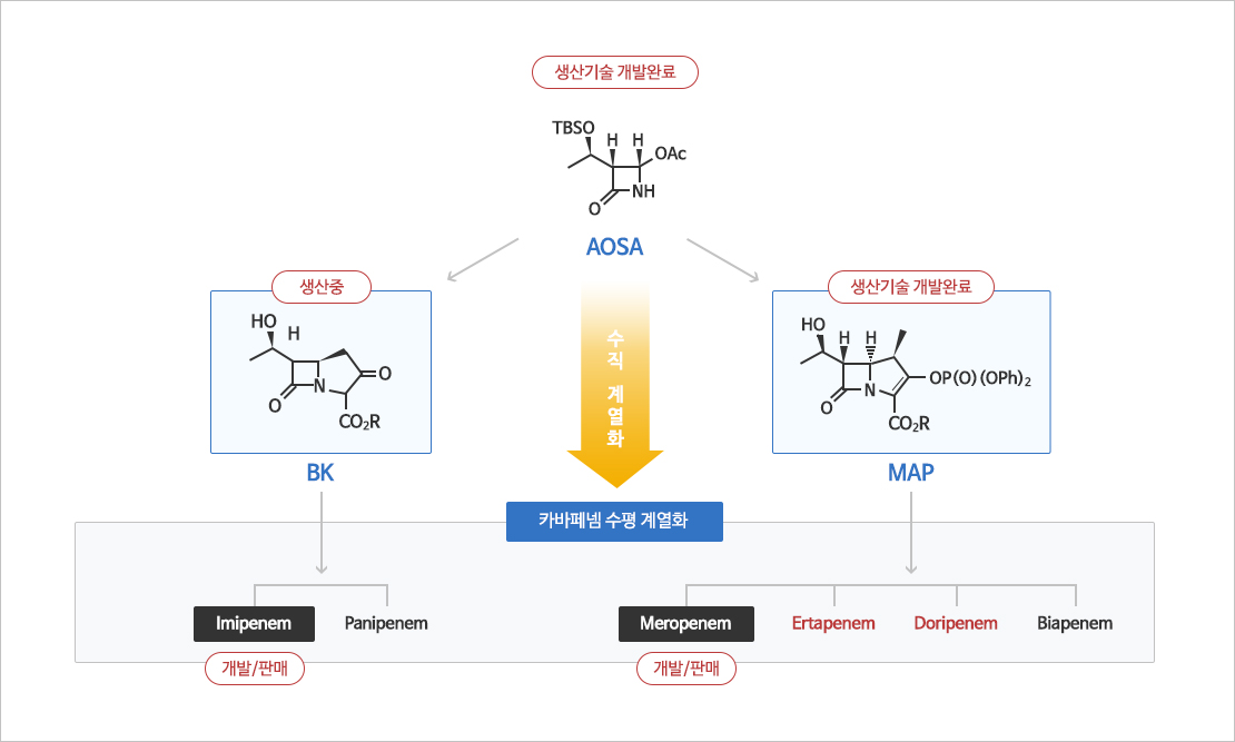카바페넴의 핵심원료인 AOSA부터 수직/수평 계열화를 통하여, Imipenem, Meropenem, Doripenem을 상업화하였고, Ertapenem의 기술개발로 FDA DMF 제출하여, 상업화 준비 중