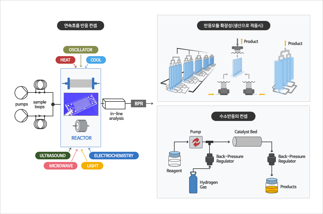 기존 Batch에서 진행하던 Chemical reaction을 연속흐름 시스템 내에서 반응함으로써, Batch type의 단점인 열전달/물질전달과 폭발등의 위험성을 최소화 시키고, 고품질의 의약품을 연속적으로 생산할 수 있는 기술